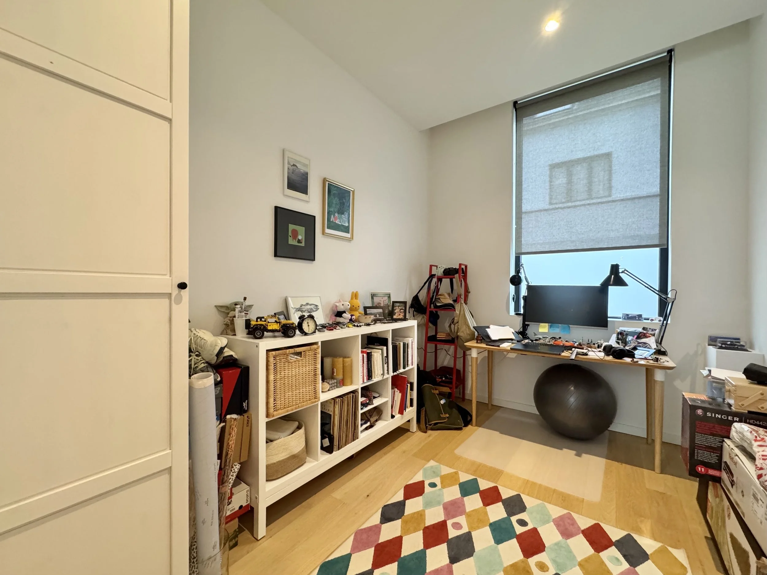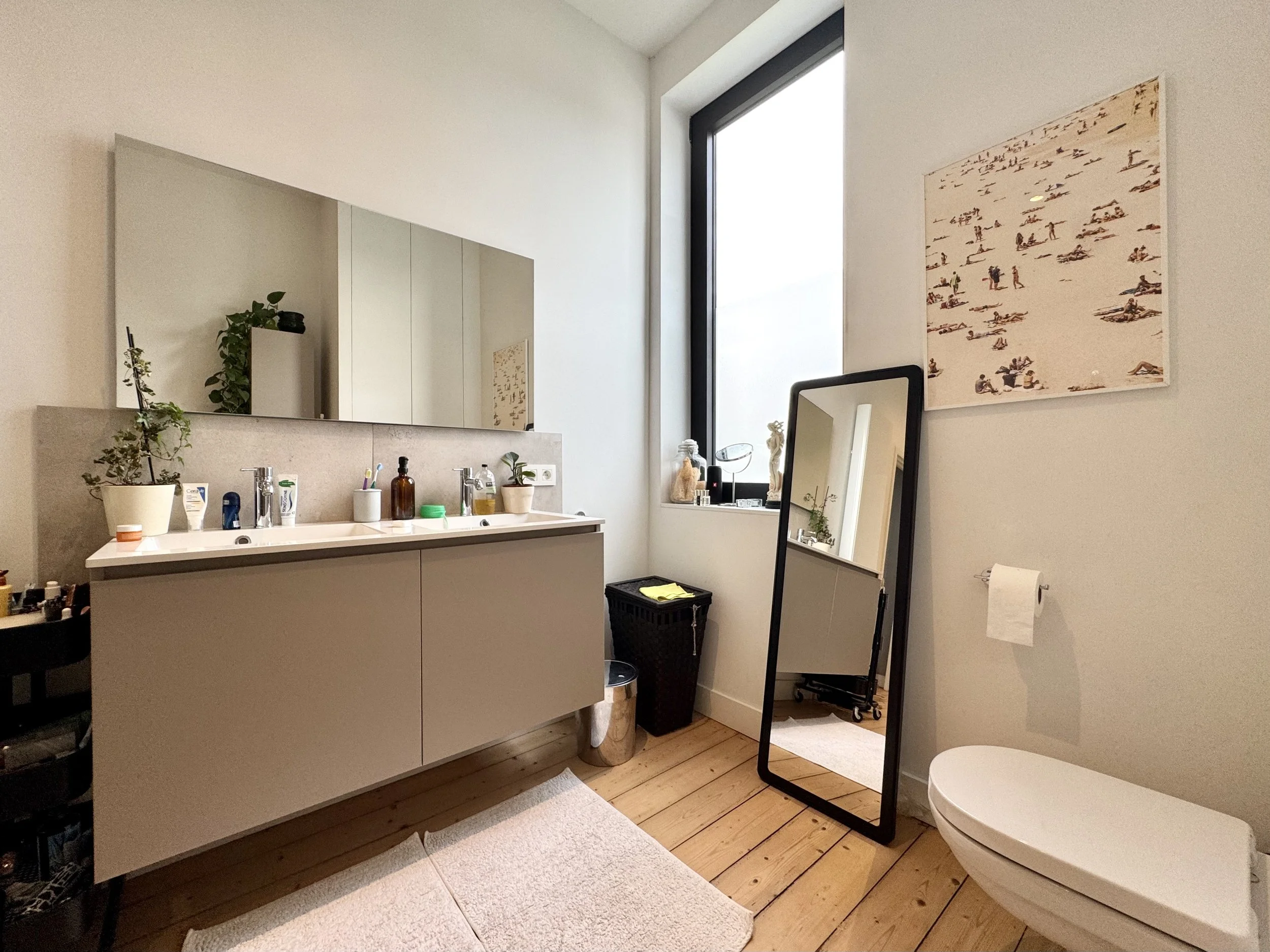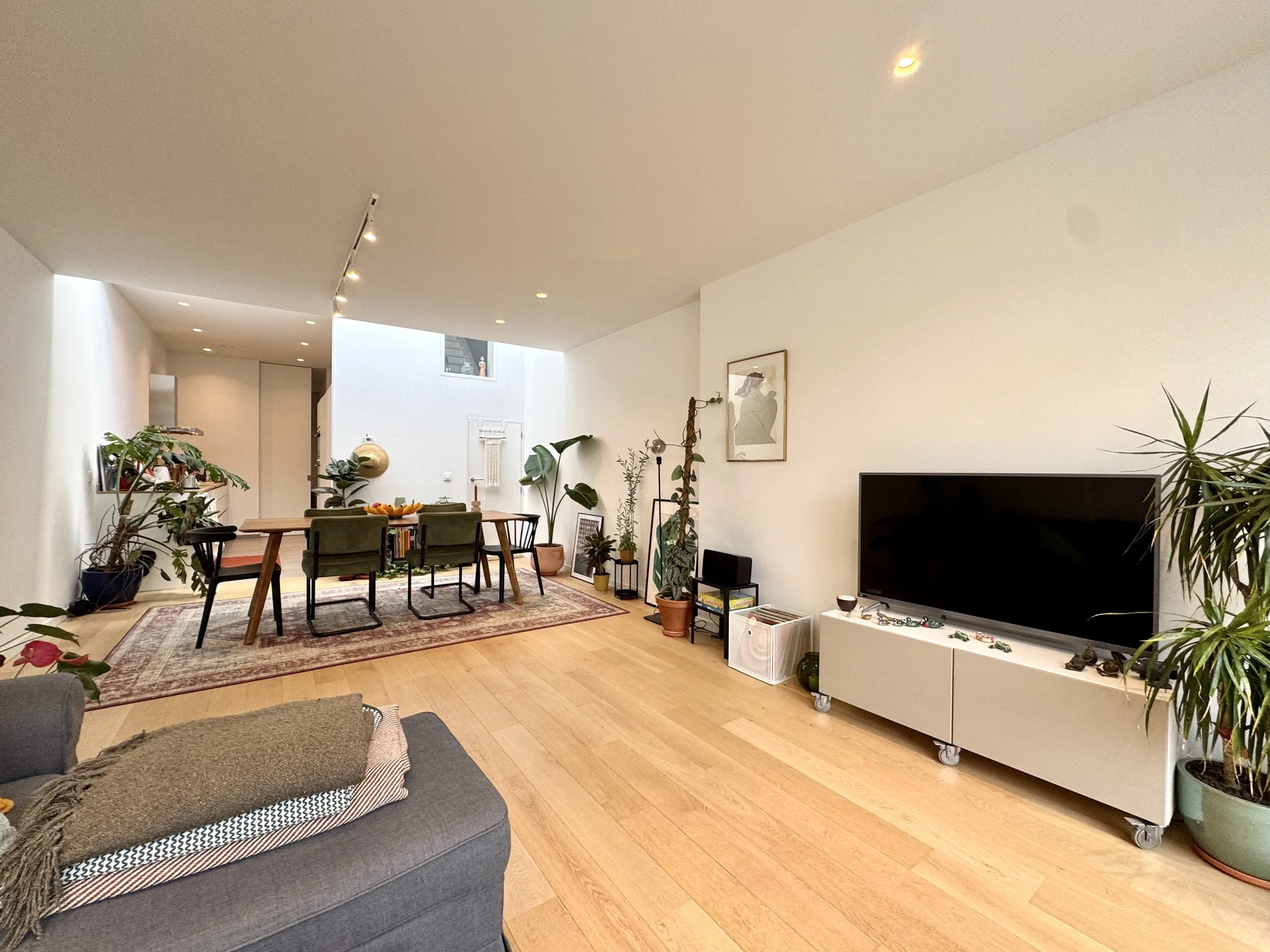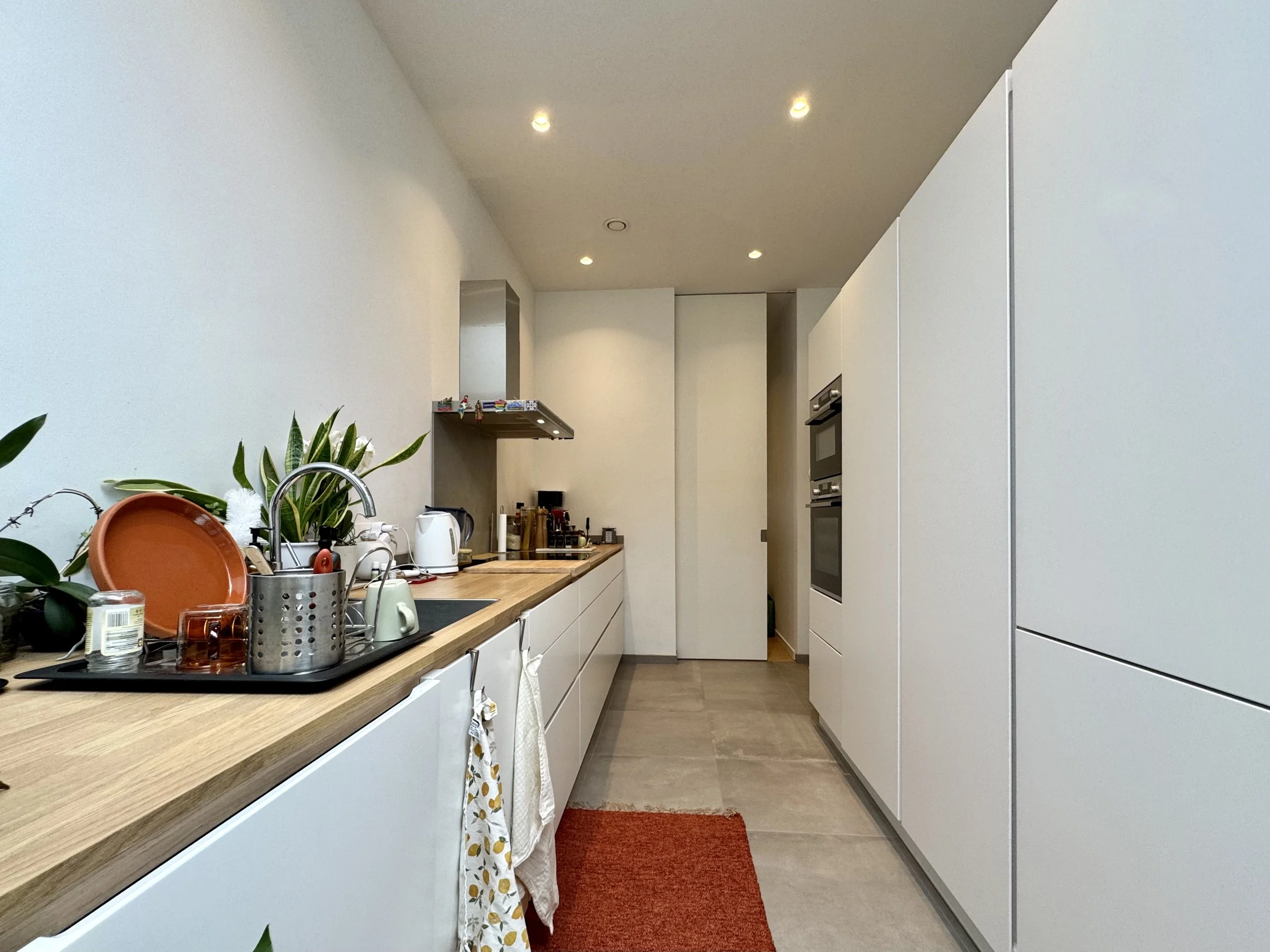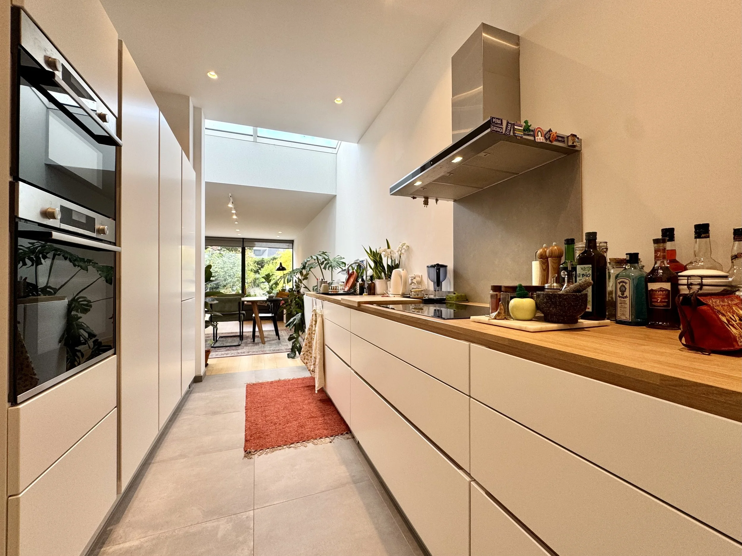 De woning is praktisch ingedeeld met een inkomhal met ruimte voor wasmachine & droogkast; toilet; voorplaats (die kan afgesloten worden via een schuifdeur) dat kan dienst doen als bureau; keuken met veel opbergruimte en alle nodige apparatuur; lichtrijke woonkamer met grote schuiframen en lichtstraat; toegang naar het perfect aangelegde terras/stadstuin.