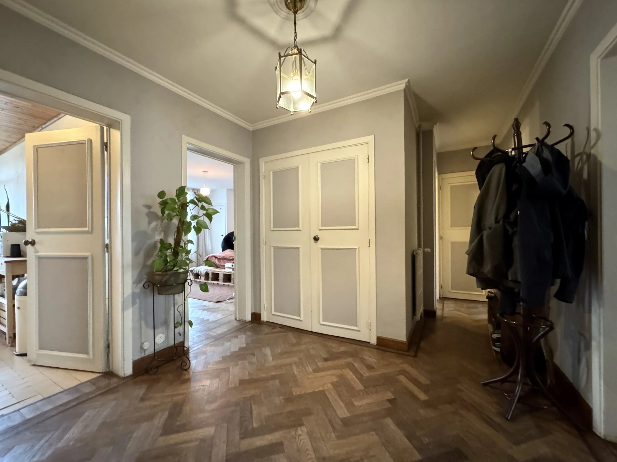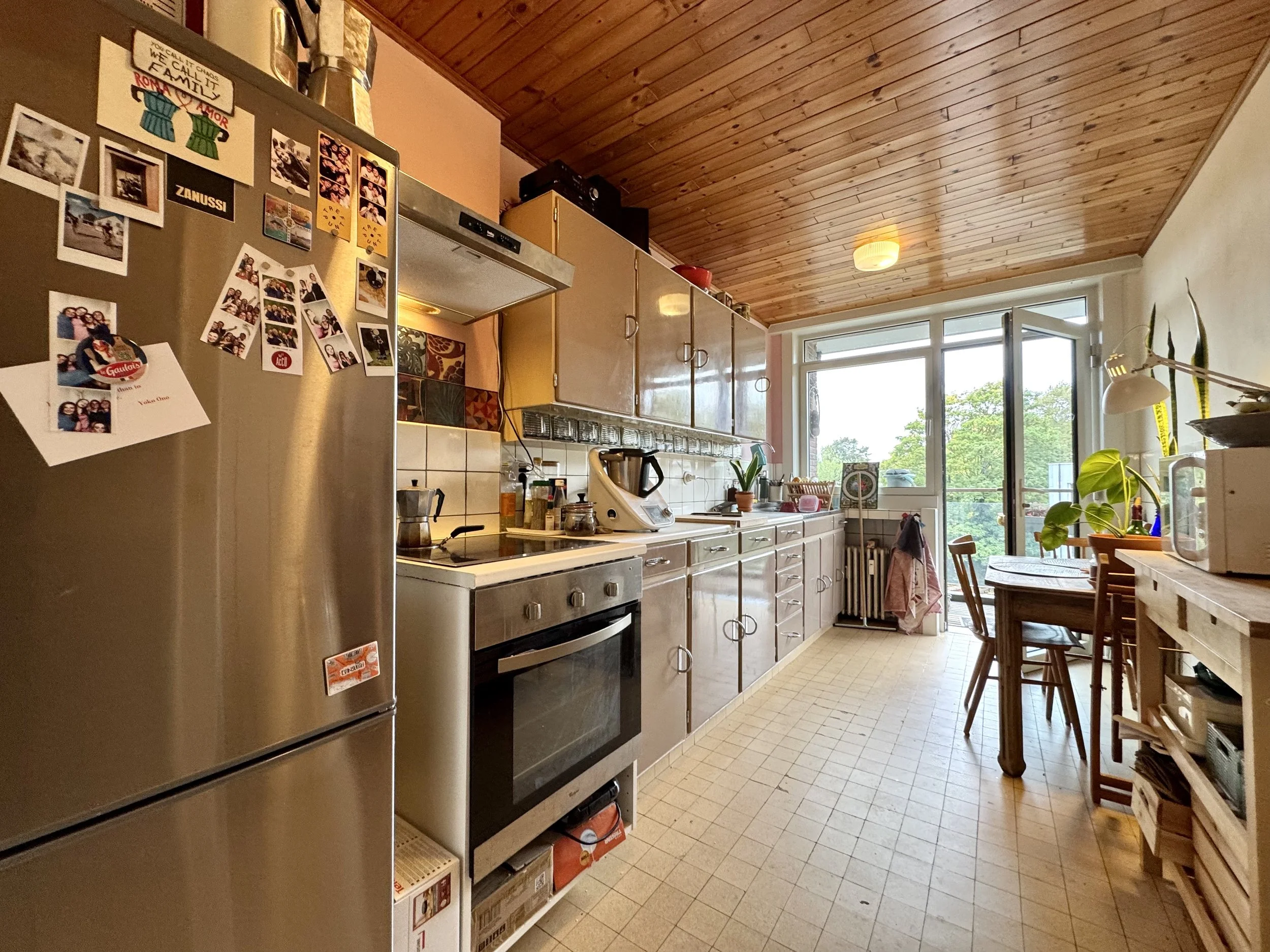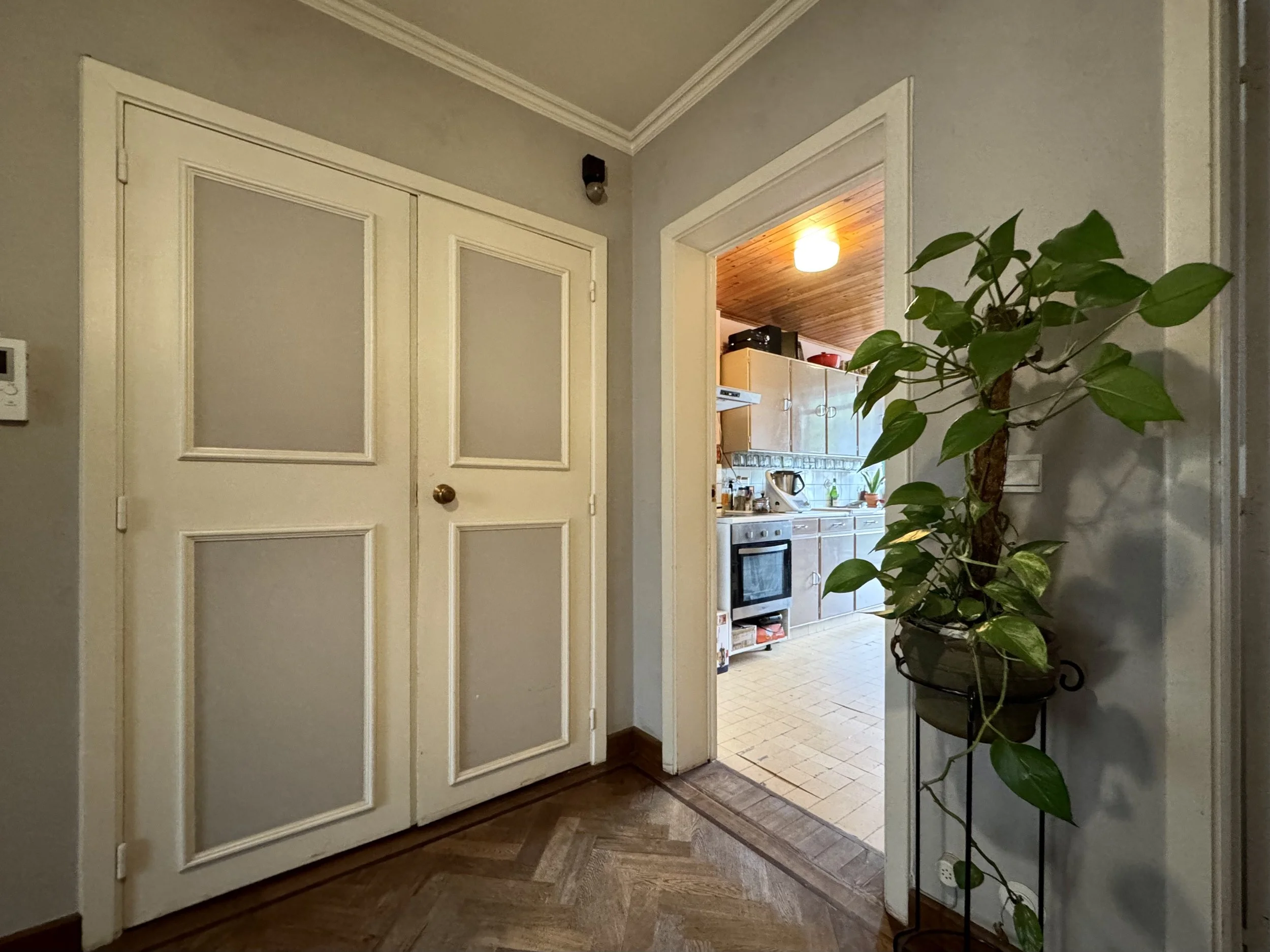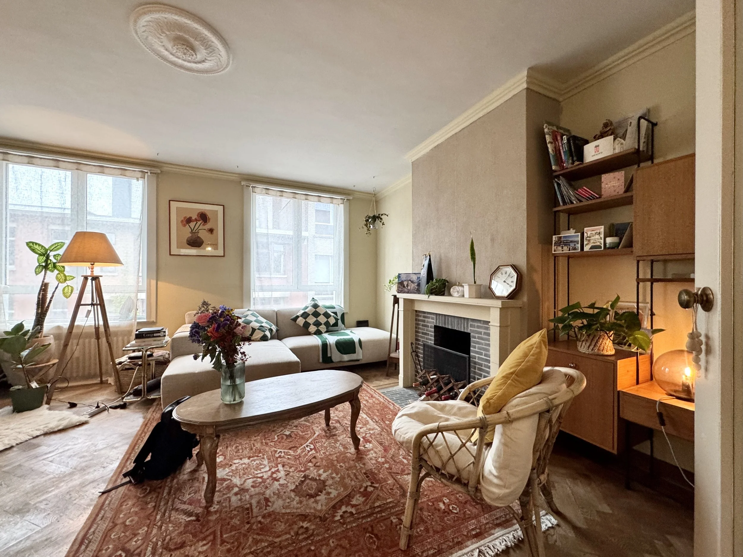 De charme, het lichtinval en de vele opbergmogelijkheden zijn alvast enkele troeven. De indeling van dit appartement op de tweede verdieping (met lift) is als volgt: inkomhal met verschillende ingemaakte kasten, gezellige leefruimte, retro keuken (voorzien van o.a. een keramische kookplaat, oven, koelkast met vriezer), toegang naar het terras (zonnekant), zeer grote slaapkamer, badkamer met aansluiting voor wasmachine (badkamer wordt volledig vernieuwd, en wordt voorzien van o.a. een inloopdouche), en een tweede kleinere kamer. Mooie authentieke elementen zoals bv. visgraatparket, schouw, etc. Ruime kelderberging inclusief.