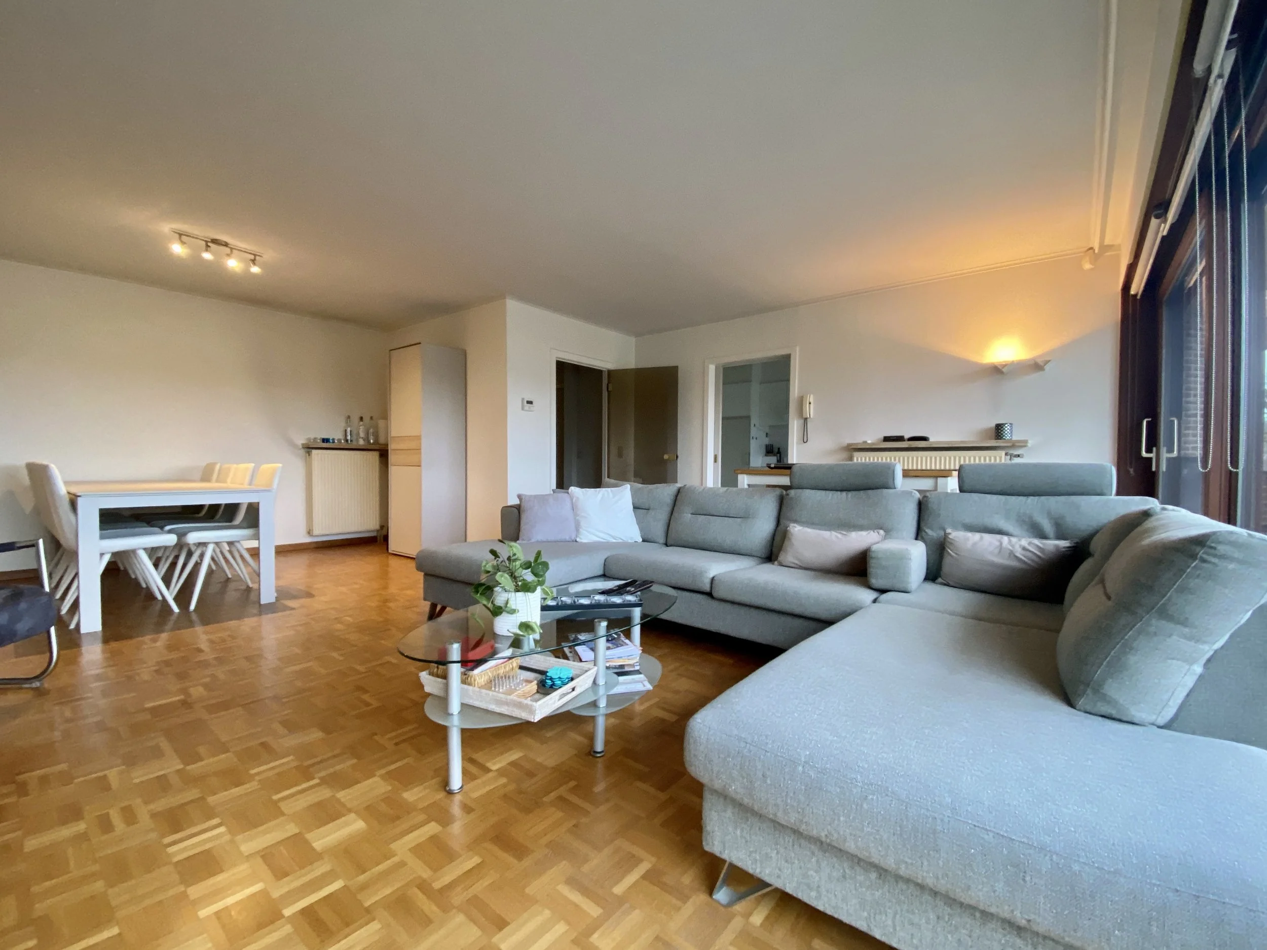 Het appartement met een oppervlakte van 113m2 omvat een inkomhal met vestiairekast, lichtrijke leefruimte in parket met aanpalend terras met zicht op de paardenrenbaan, uitgeruste keuken, berging, 2 grote slaapkamers, technische berging, toilet, badkamer met tweede toilet en aansluiting wasmachine, kelderberging. Tevens is er een privatieve garagebox en een gemeenschappelijke fietsenberging.