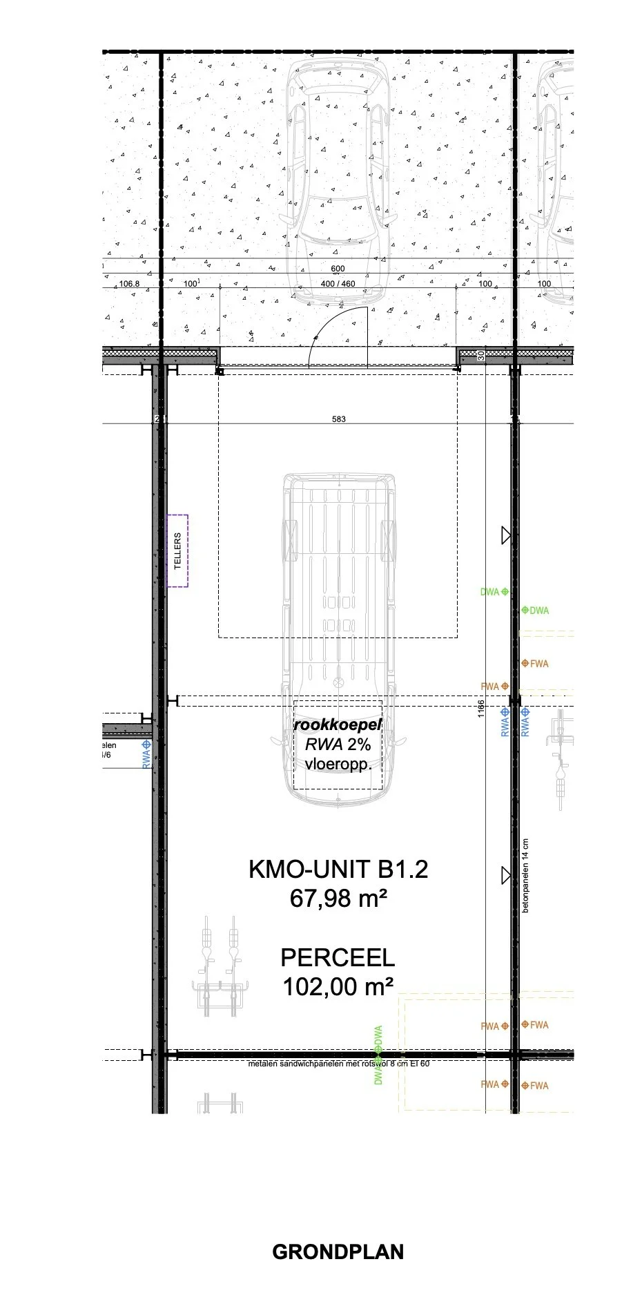 De loods heeft binnen een oppervlakte van +/- 70m2 en staat op een perceel van +/- 100m2. De loods is voorzien van een grote sectionaalpoort, verlichting, lichtkoepel, branddedectie, brandblusappartaat, drijfkracht, stadswater en regenwater.